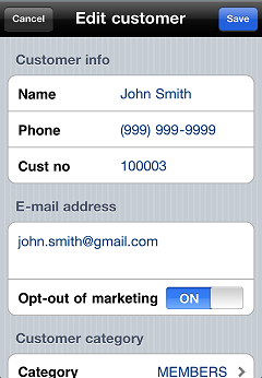 1. If you are using CustomerConnect, tap the Opt-out of marketing on/off switch to change the setting for the customer.
