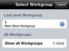Tap the Show all Workgroups button to display all available workgroups. Each workgroup is associated with a store that is managed by the server you are connected to.