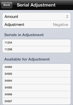 To create a negative adjustment for a serialized item, tap the serial number(s) you want to remove from your inventory in the Available for Adjustment list. Each time you tap a serial number, it is moved to the Serials in Adjustment list and the Amount value is increased by 1.