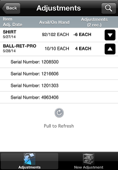 When you are finished adding or removing serial numbers, tap Back to return to the Adjustment Detail screen, and then tap Save to save the adjustment. On the