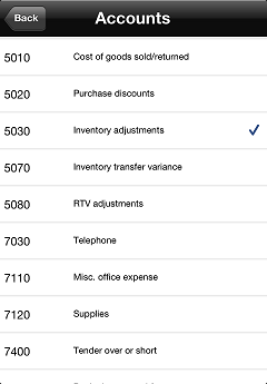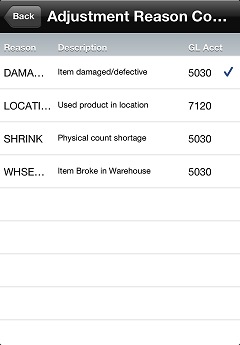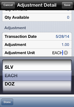 When you create an adjustment, it is saved to your CPMobile device, allowing you to modify it before exporting it to your Counterpoint database. You can update the quantity for an adjustment from the Adjustments screen or from the Adjustment Detail screen. You can also use the Adjustment Detail screen to change the transaction date for an adjustment, choose the adjustment unit, select a reason code for the adjustment, specify the account for the adjustment distributions, and enter reference text or a document number for the adjustment.