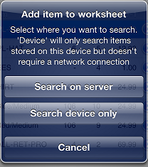 a message appears, prompting you to look up an item on your Counterpoint server or on your CPMobile device. Tap Search on server to look up an item on your Counterpoint server, tap Search device only to look up an item in CPMobile device's item cache, or tap Cancel to return to the worksheet.