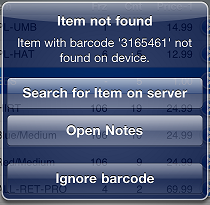 a message appears, indicating that the item cannot be found. Tap Search for Item on server to search for the item on your Counterpoint server, tap Open Notes to record a note about the missing barcode, or tap Ignore barcode to ignore the missing item and return to the worksheet.