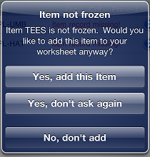 a message appears, indicating that the item is not frozen. Tap Yes, add this item to add the item to the worksheet, tap Yes, don't ask again to add the item and automatically add all other unfrozen items to the worksheet without prompting you, or tap No, don't add to ignore the unfrozen item and return to the worksheet.