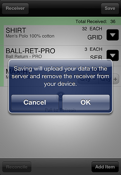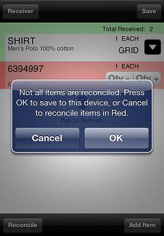 message appears, prompting you to reconcile those lines. Tap Cancel to return to the receiver and tap the Reconcile button to attempt to reconcile the receiver lines, or tap OK to save the receiver to the device and return to the Receivings screen.