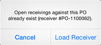 A Closedmessage appears if a receiver already exists on the server for the purchase order you selected. Tap Load Receiver to load the existing receiver on your CPMobile device.