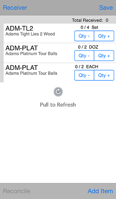 1. To add an item to the receiver that isn't on the original purchase order, scan the item's barcode or tap the Add Item button to display the Items screen and look up the item you want to add to the receiver.