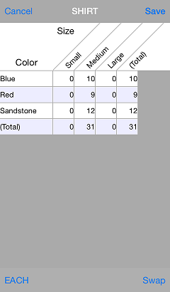 By default, the grid table displays the first two dimensions in the grid (e.g., color/size). If the grid has three dimensions (e.g., width), tap the corresponding button to display the grid picker, which allows you to select the dimension you want to summarize and filter it to a specific value. Tap the Swap button to change the positions of the dimensions in the grid table.