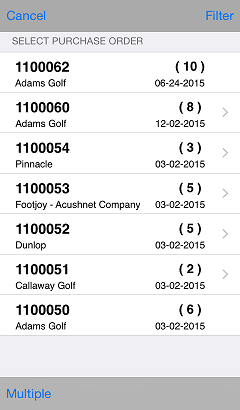 Only purchase orders in the batch associated with your User ID appear on the Select Purchase Order screen. To load purchase orders from another batch, log in to CPMobile with the corresponding User ID.