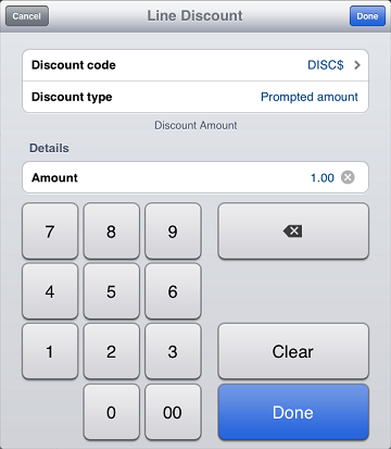 Line Discount screen indicates the type of discount code you selected (either Amount, Percent, Prompted amount, or Prompted percent), along with the default Amount or Percent for the discount.