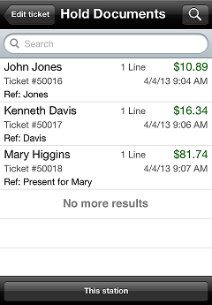 Hold Documents screen displays all of the tickets that were placed on hold on your CPMobile device. Tap a hold ticket to recall the ticket and return to the Ticket screen, allowing you to complete the ticket.