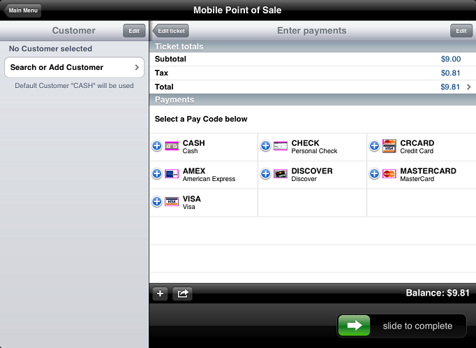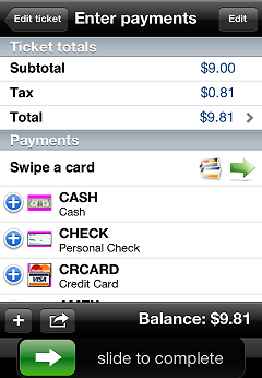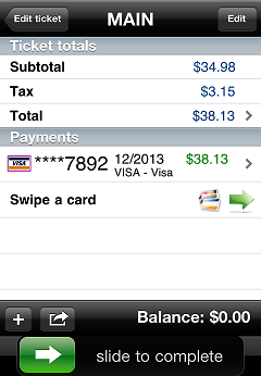 The payment amount is automatically set to the ticket balance. To specify a different amount for the payment, tap the payment line to display the