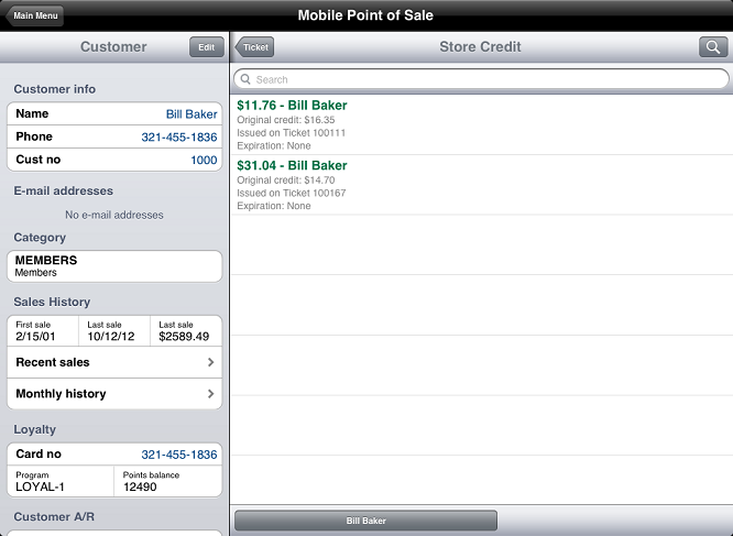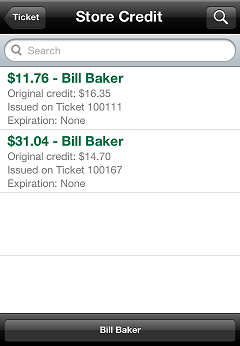 Store Credit screen displays all of the store credits that have been issued to the customer assigned to the ticket.