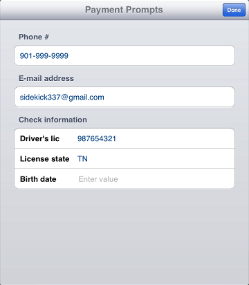 If any of the validation prompts defined for the pay code are required, the Payment Prompts screen appears automatically when you tap Done on the Amount screen, or when you tap Exact Change or Next Dollar.