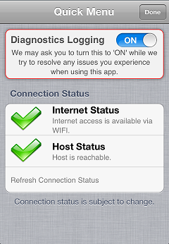 If you are asked to enable diagnostics logging for CPMobile by NCR Counterpoint Support, you can do so via the Quick Menu. The Quick Menu also allows you to view the status of the Internet connection for your CPMobile device(s), as well as your connection to your NCR Counterpoint server.