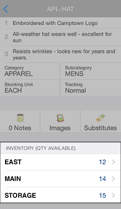 INVENTORY (QTY AVAILABLE) section of the item details screen.