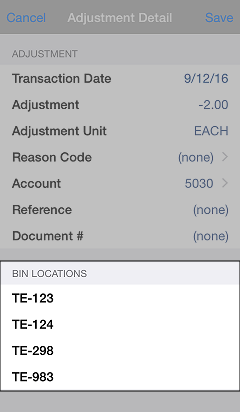 Adjustment Detail screen. If bin locations have been assigned to the item, they will appear in the BIN LOCATIONS section.
