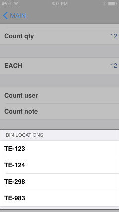 To view bin locations for an item you are counting, tap the button for the item on the Physical Count worksheet, scroll down to the